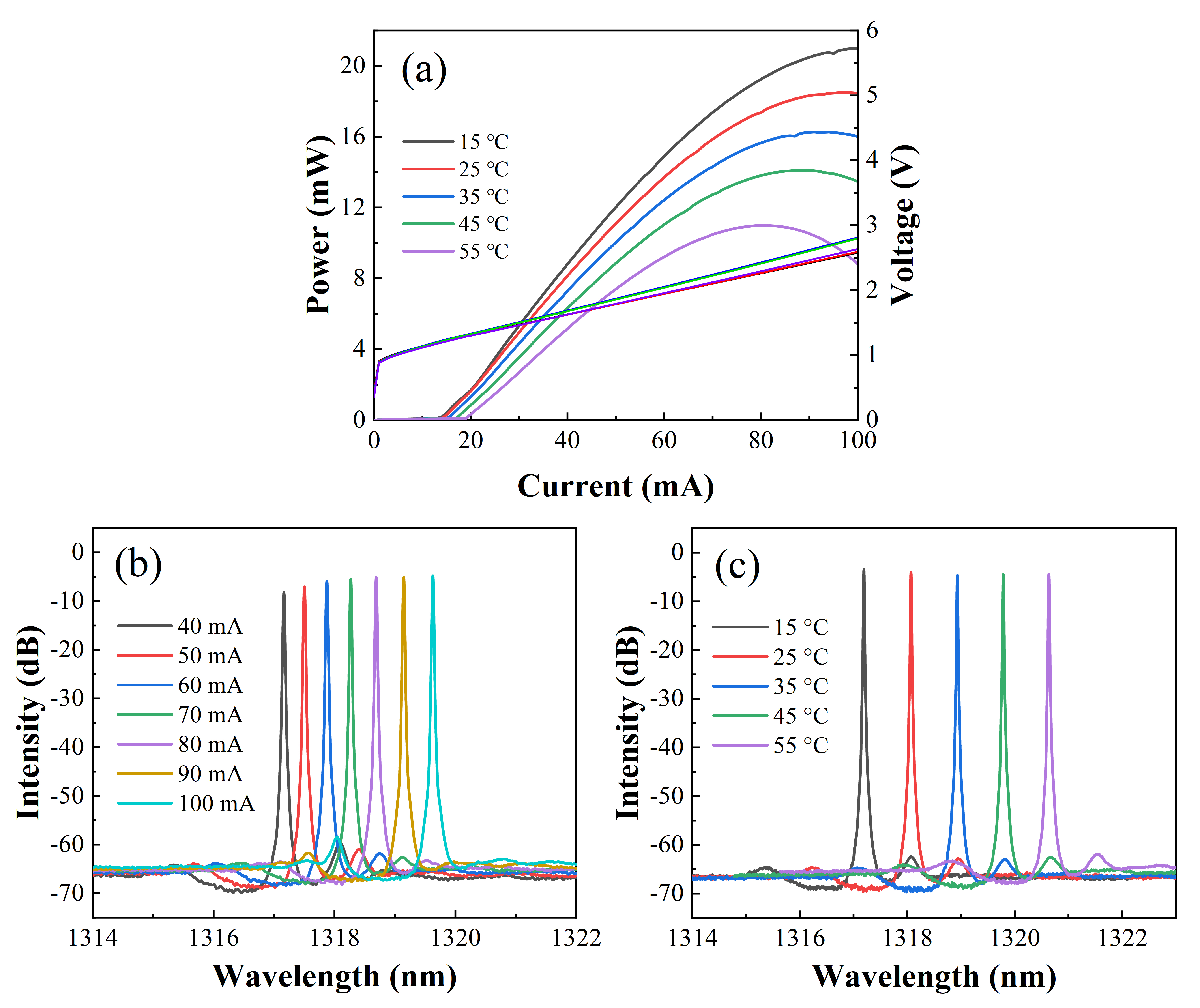 图2. 功率及光谱特性,(a) 不同温度下的PIV特性,(b) 不同电流下的光谱结果,(c) 不同温度下的光谱结果