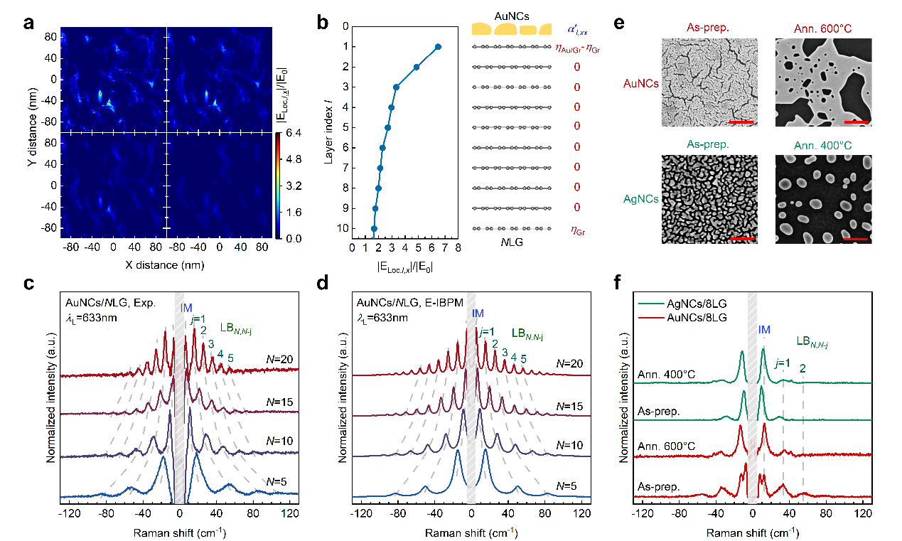 该研究进一步构建了一个定量理论模型,用于描述层间呼吸模式的增强机制。该模型同时考虑了金纳米腔(AuNCs)对石墨烯界面极化率的调制作用,以及其所产生的强局域等离激元电场。电磁场仿真结果直观显示,金纳米腔周围形成了高度局域化的等离激元电场(图2a),并有效调制了界面处石墨烯层的极化率(图2b)。在此基础上,通过在传统层间键极化率模型(一种描述二维材料层间振动模式拉曼强度的理论模型)中引入电场和极化率调制效应,提出了电场调制层间键极化率模型(E-IBPM)。该模型成功复现了实验观测到的AuNCs/多层石墨烯体系中呼吸模的强度分布规律(图2c,2d)。该研究还通过使用不同金属(如银纳米腔)及不同形貌的纳米腔(通过改变退火温度实现,图2e),验证了该等离激元增强测量方法具有良好的普适性(图2f),为拓展其在各类范德华异质结界面表征中的应用奠定了基础。