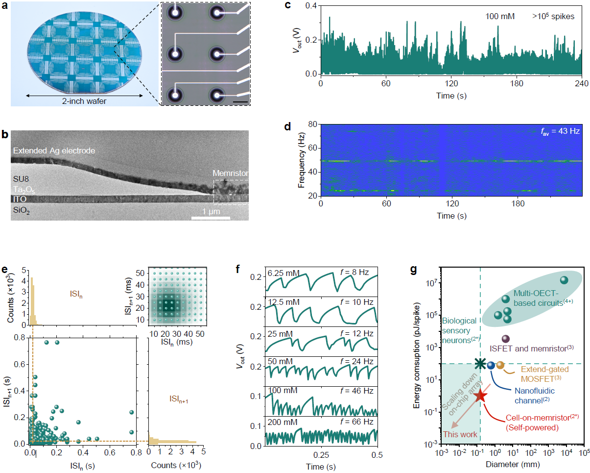 基于CMOS兼容制造工艺,实现了CoM器件的晶圆级阵列制备,演示了该领域中首个高密度化学感受器阵列系统。阵列中的单器件可以在盐水溶液的离子刺激下,自发、原位地产生电压振荡信号,其振荡频率与离子浓度直接相关。性能表征测试表明,阵列上的CoM器件表现出包括亚阈值振荡、非周期性簇状放电、全有或无尖峰脉冲以及随机振荡等高阶神经元动力学行为。