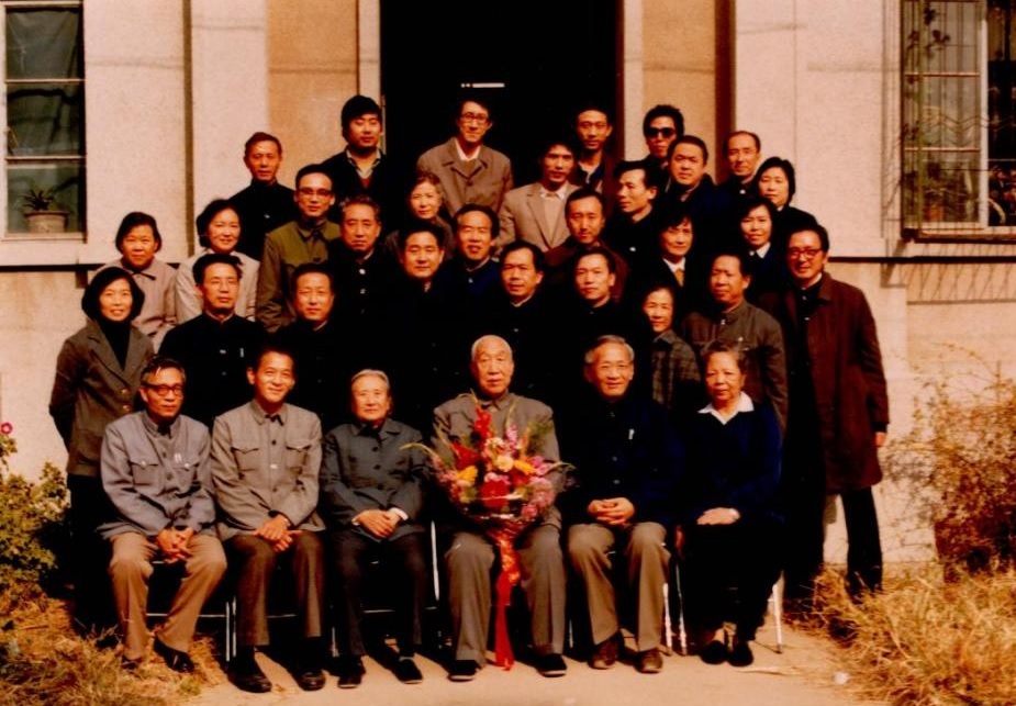 图6 1985年,前任所领导刘再生同志(前排右三)祝寿活动合影。王守武(前排右二)、林兰英(前排右一)、王守觉(前排左二)、王启明(前排左一)、吴德馨(二排左一)