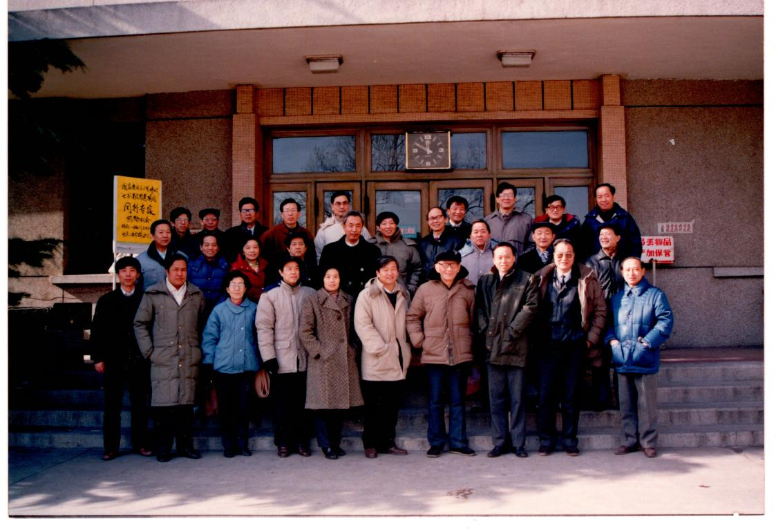 图7 国家光电子工艺中心“七五”建设引进项目同行专家预验收会合影,王守武(前排左七)、吴德馨(前排左五)