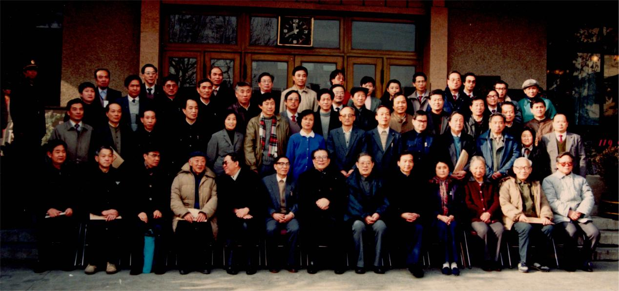 图7 国家光电子工艺中心“七五”建设引进项目同行专家预验收会合影,王守武(前排左七)、吴德馨(前排左五)